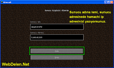 10. Aşağıdaki resimde sunucu adına oyuna girerken yazdığınız ismi yazıyorsunuz ve sunucu adresine de hamachi ip adresinizi yazıyorsunuz.