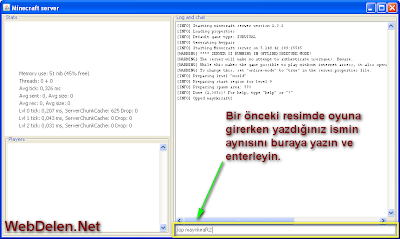 8.Gelen ekrandaki altta çıkan kutucuğa '/op (oyuna girerken yazdığınız ismi)' yazın ve enterleyin. Uygulamayı kapatmayın yoksa serverinize giremezsiniz.