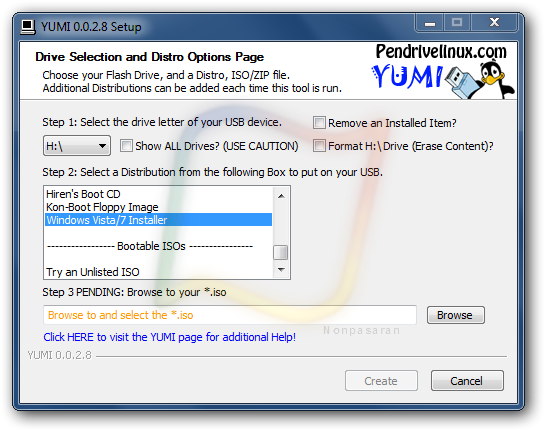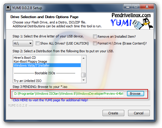 D- Browse butonuna basarak Windows 7 ISO dosyasını gösterin ve Create diyerek işlemi başlatın.