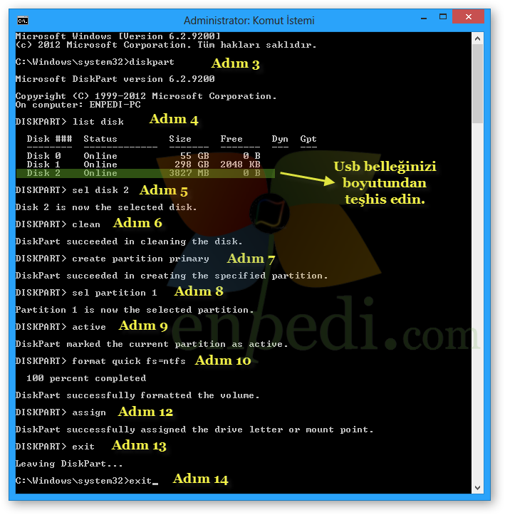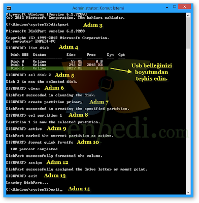 5- select disk* yazın ve Enter'a basın. ("*" yerine yazacağınız numara burada USB flash sürücünüze karşılık gelen numara olmalı örnekte select disk 2)